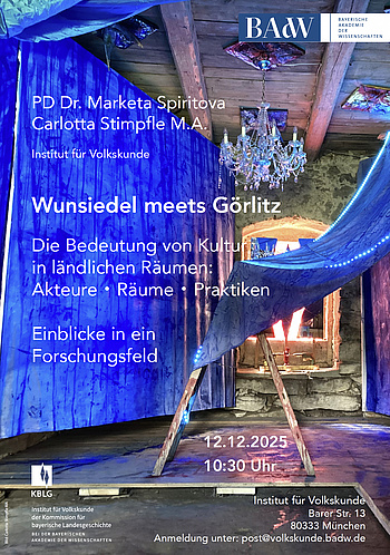 In unserer Vortragsreihe "Forschung am Freitag" laden wir für den 12.12.2025 um 10:30 Uhr herzlich ans Institut für Volkskunde ein. PD Dr. Marketa Spiritova und Carlotta Stimplfe M.A. werden aus ihrem Forschungsprojekt zur Rolle von Kultur und Kulturakteuren im ländlichen Raum (KRAP) berichten und wir freuen uns auf eine anregende Diskussion.
